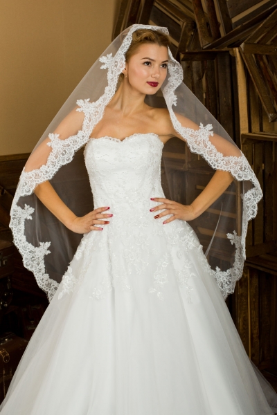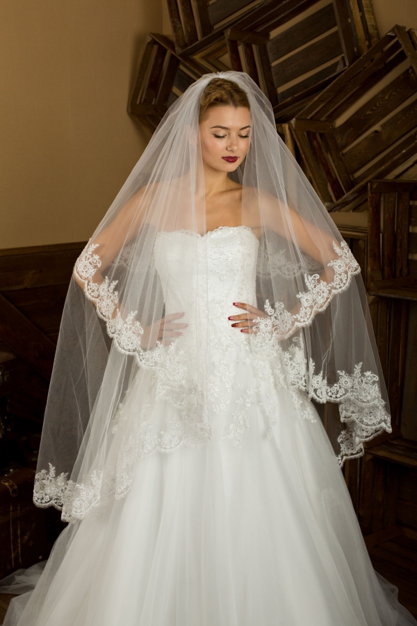 Длинная фата в два яруса. По краю фаты нежное французское кружево.