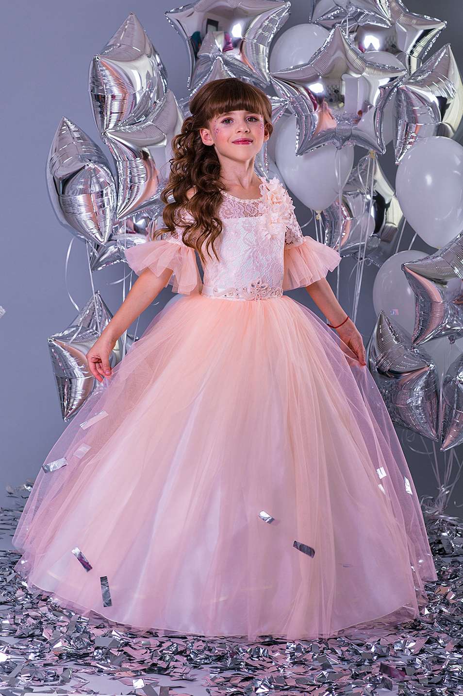 Платье для юной принцессы изготовлено из сатина и еврофатина. Корсет покрыт французским сутажным кружевом, украшен 3D цветами и жемчугом. Юбка со сборкой. По спинке застежка "молния " и шнуровка. Изюминка модели - оригинальные рукава и пояс с вышивкой. Модель выполнена в цвете пудра.Похожие модели