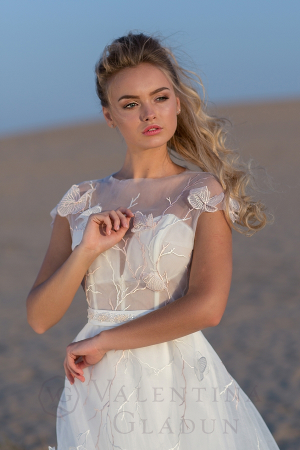 Нежное свадебное платье в авангардном стиле. Модный принт– бабочки парят невесомо на платье.