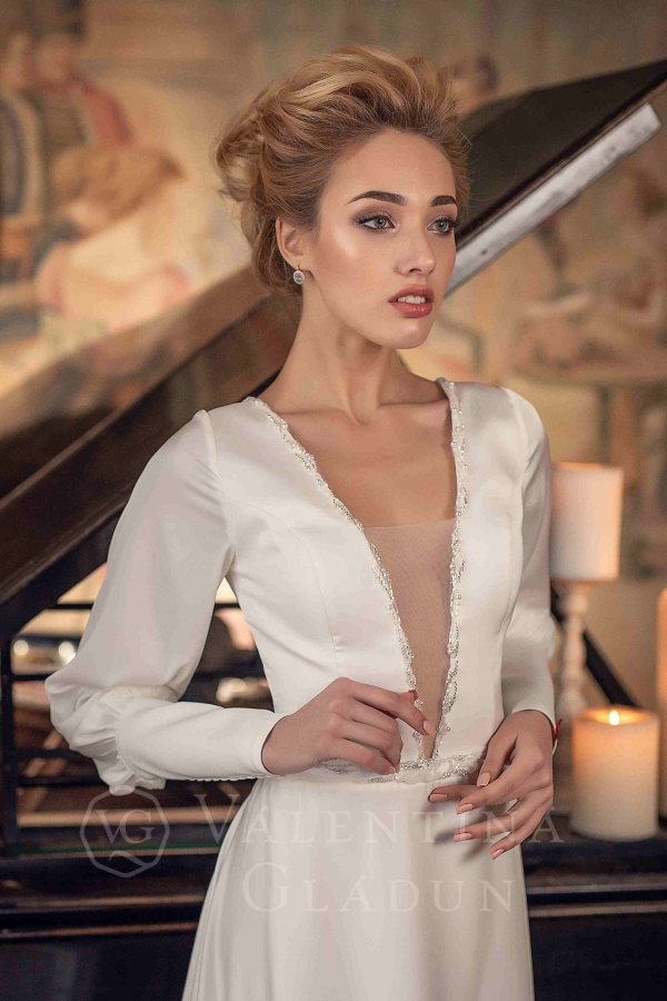 Лиф с глубоким V-образным декольте, которое украшено вышивкой бисером. Юбка легкая, струящаяся, с длинным шлейфом. По спинке застежка "молния" и фиксирующая шнуровка. Линию талии подчеркивает пояс с вышивкой бисером.Похожие модели