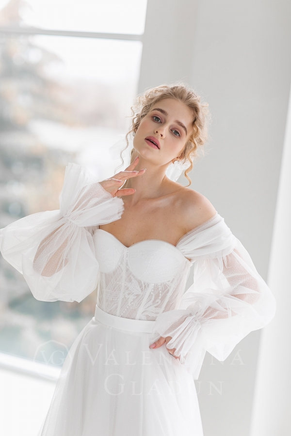 Изящное свадебное платье с пышными рукавами-фонариками из воздушного фатина в оттенке айвори. Корсет без бретелей с вырезом “сердечко” украшен кружевными аппликациями и драпировками из фатина. Короткие пышные рукава-фонарики могут прикрывать плечи или быть спущенными. Умеренно расклешенная юбка с высоким разрезом спускается от талии, подчеркнутой узким поясом.Похожие модели